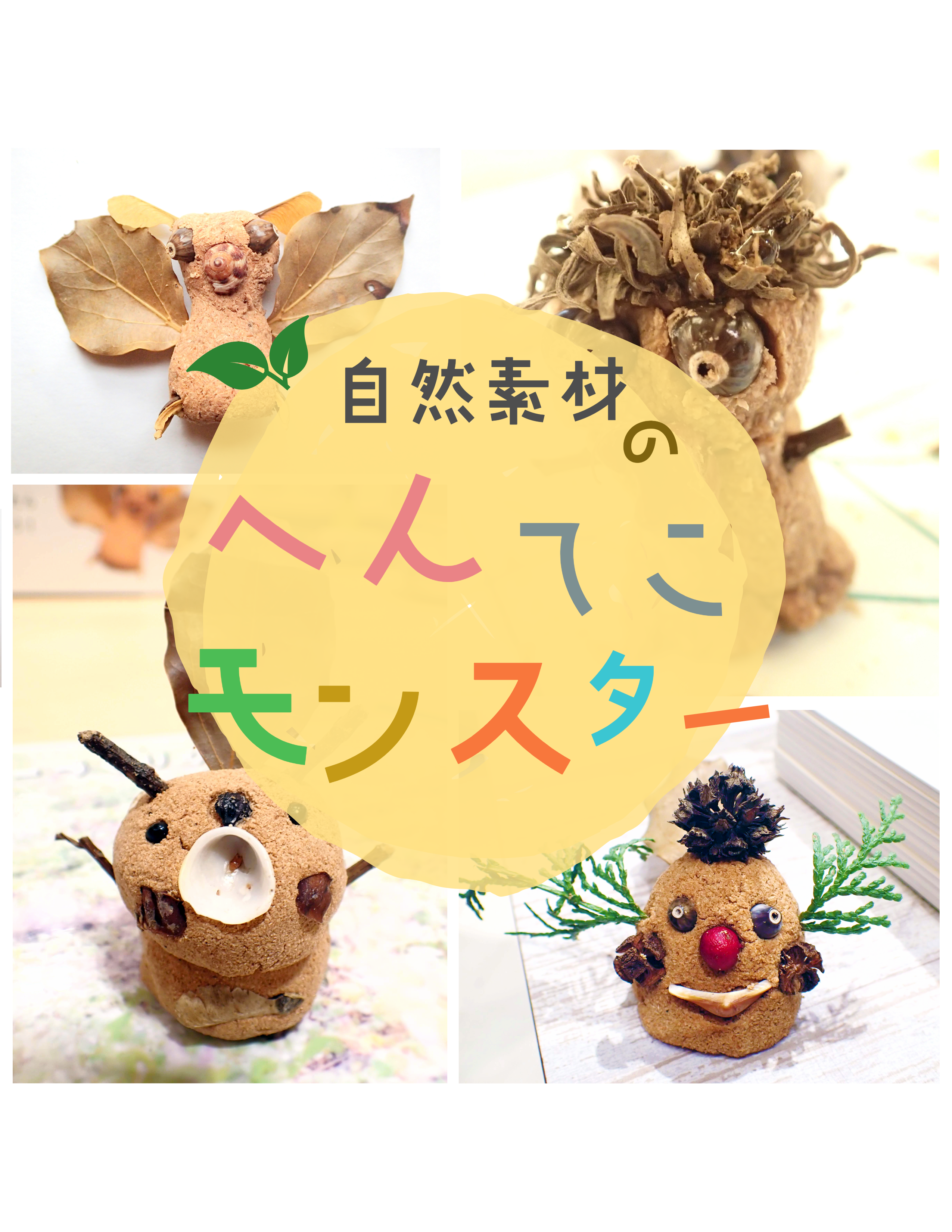 オリジナルの木のねんどに、木の実や貝殻、草の種などの自然素材をくっつけて、へんてこなモンスターをつくるものです。(詳細はこちら)